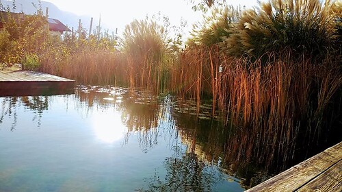 - Großer Garten mit Schwimmteich, Sitzmöglichkeiten und Liegestühlen