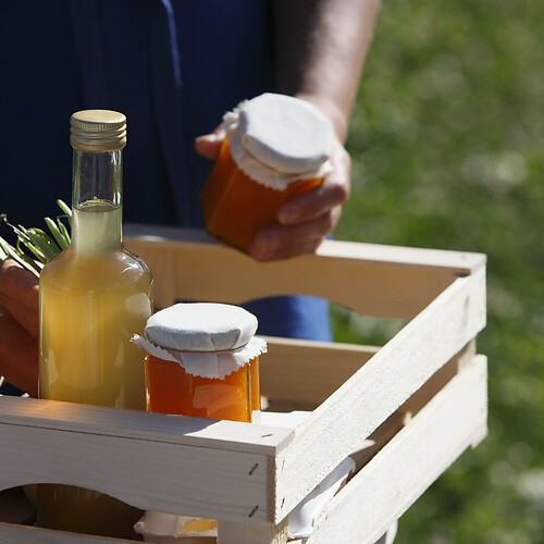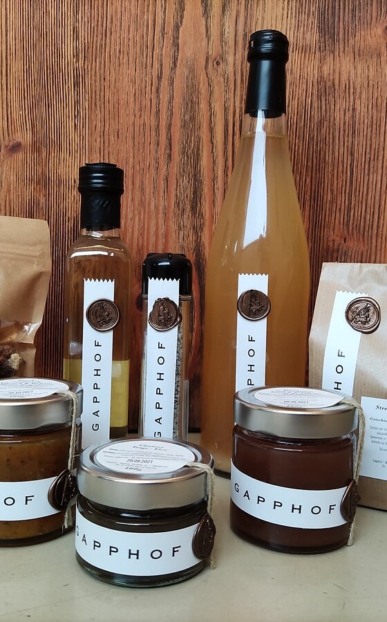 Produktecke mit Selbstgemachtem aus unbehandeltem Obst, Kräutern und Gemüse, z.B. Apfelsaft, Kräutersalz, Apfelchips, Marmeladen, Chutney