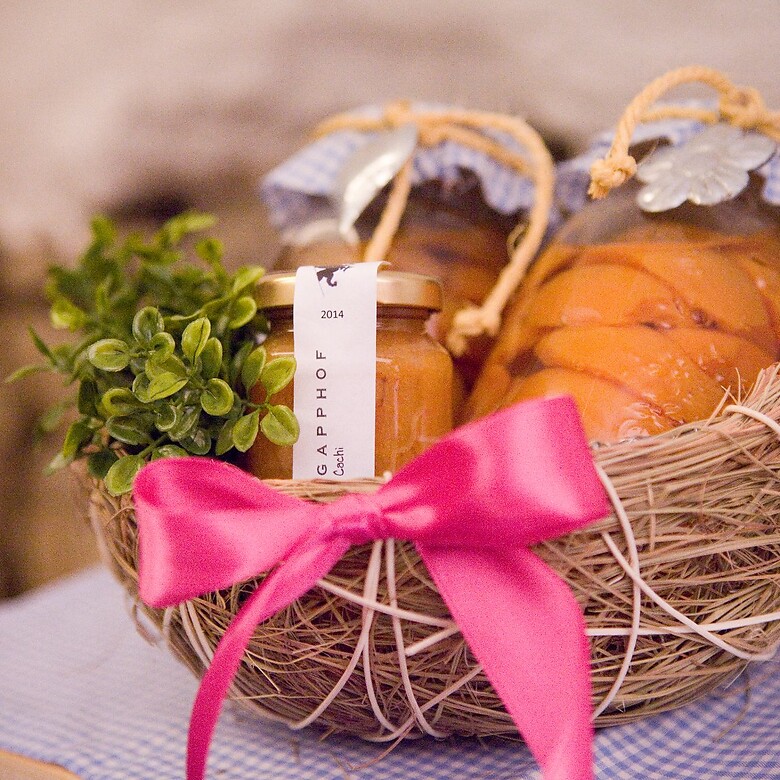 GAPPHOF’S FRÜHSTÜCKSBOX, randvoll mit regionalen Köstlichkeiten und täglich wechselnd: Milchprodukte von der Sennerei Algund, Backwaren frisch von der Bäckerei Tauber in Algund, Fruchtaufstriche, Chutneys, Trockenobst, Nüsse und Kräuterspezialitäten – alles hausgemacht von unserem Hof, Wurstwaren aus handwerklicher Produktion eines ausgewählten Betriebs